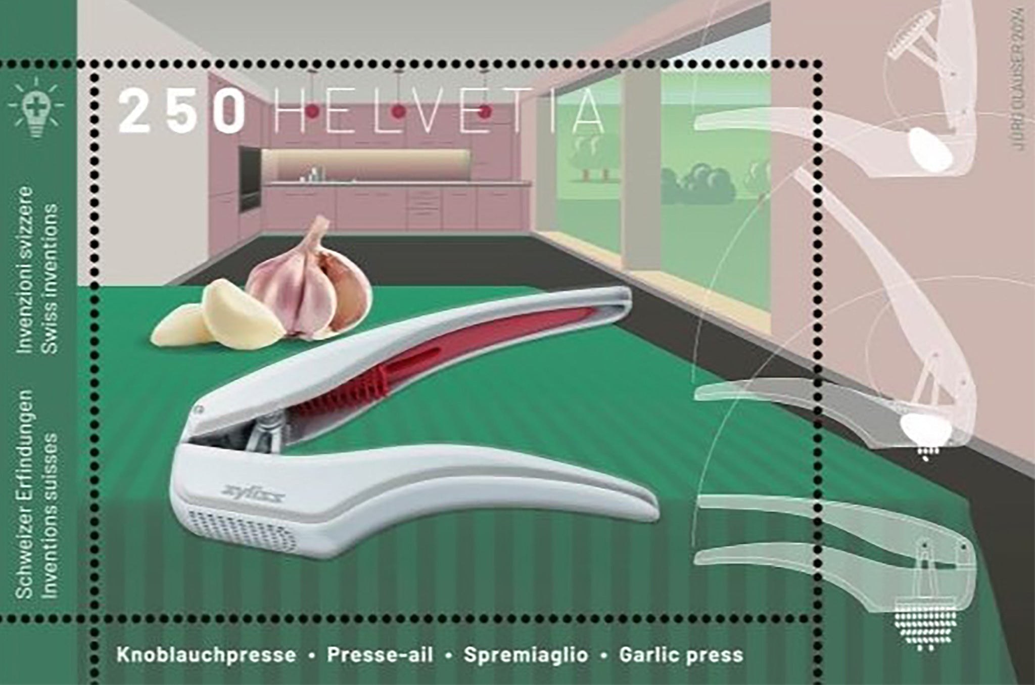 In 2024, Swiss Post honoured the iconic Zyliss Susi 3 garlic press with a special stamp, as part of a tribute series celebrating “Swiss Inventions.”