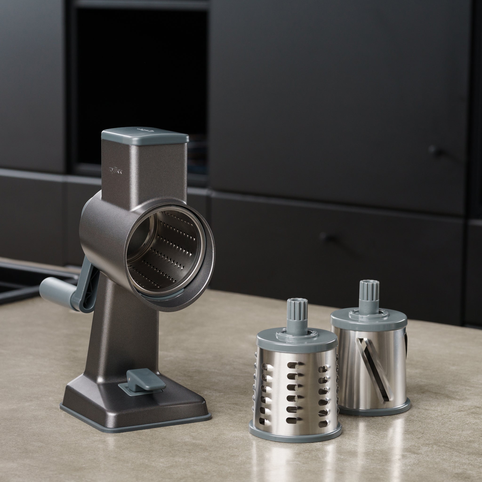 The set includes three interchangeable stainless steel drums - fine, coarse, and slicing - perfect for cheese, vegetables, nuts, and more. Additional drums are available separately for extra versatility.